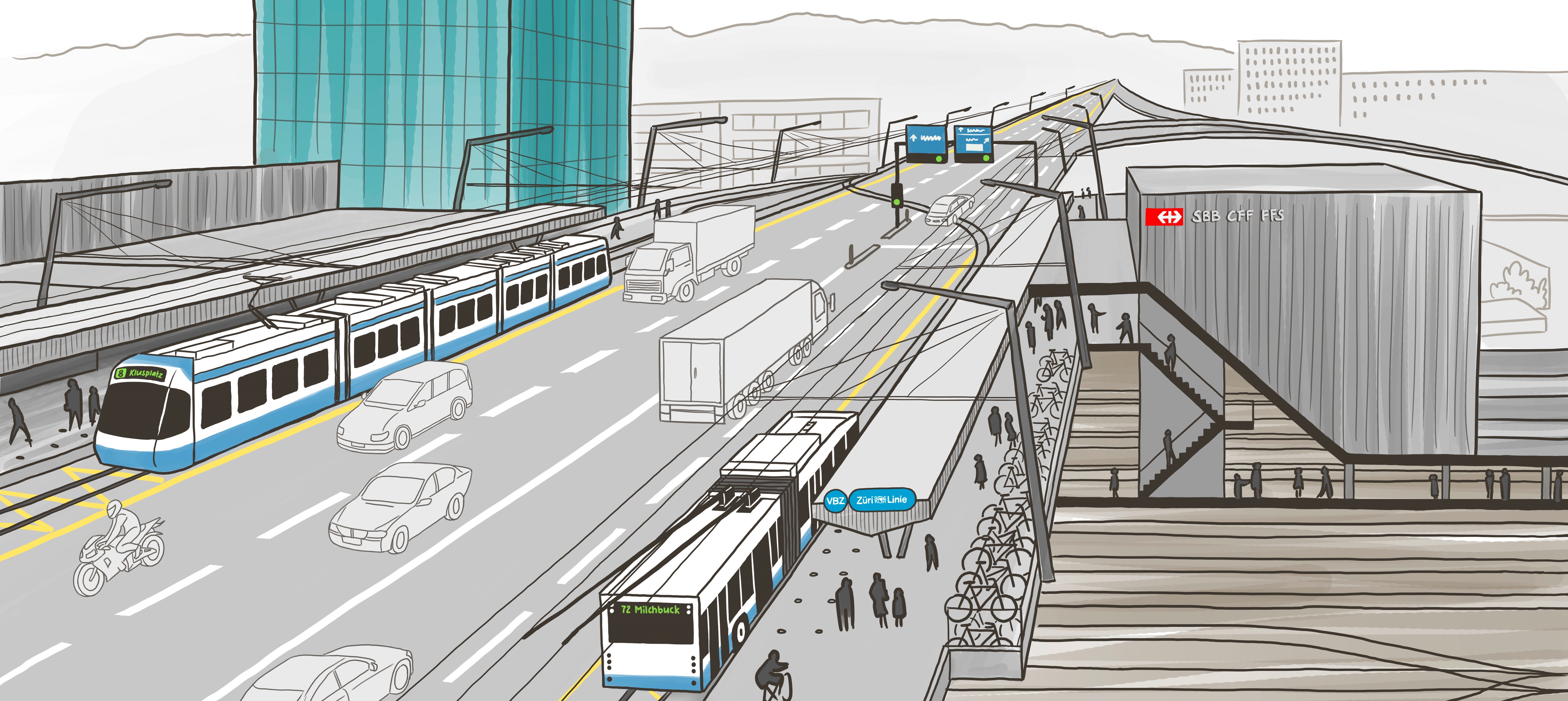 Das Ziel dieser Visualisierung ist die Fahrgastströme an der Station Hardbrücke in Zürich aufzuzeigen. Es soll grafisch dargestellt werden, zu welcher Zeit, von welchen Linien und in welche Richtung sich wie viele Fahrgäste bewegen.